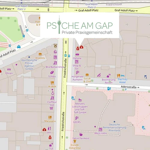 Unsere Praxis liegt zentral in Düsseldorf, in fußläufiger Nähe zur Haltestelle XYZ. Sie erreichen uns bequem mit öffentlichen Verkehrsmitteln oder mit dem Auto.